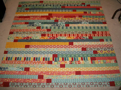 I love that you put in the red squares - nice random placement, too. That ain't easy! Way to go, kiddo. (I saw a very different strip quilt with the squares in random spots last week, and thought "I gotta try that!" I'm still working on H2H, but I did finish the PL Open House quilt! (pat pat on my own back)