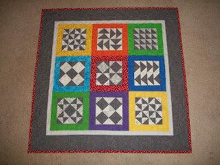 It's been a month since my last post. A lot going on at my house, spring cleaning, family responsibilities. Regardless, I have several pictures to post. This has to be one of my favorite months as all the colors in the crayon box are fair game. Pictured is a Rainbow Crayon block. Also six rainbow string blocks and two 36 patch blocks.